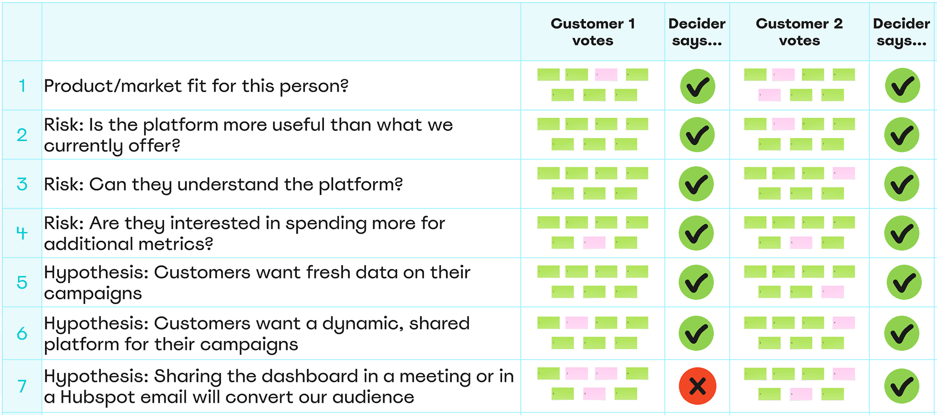 To score the product fit of DataDirect, the design sprint included a scorecard that was filled out for each customer. As each customer navigated through the prototype, the team and I gauged their response to important benchmarks, determined on Day 1 of the sprint. Each green or pink square represents a team member's opinion.