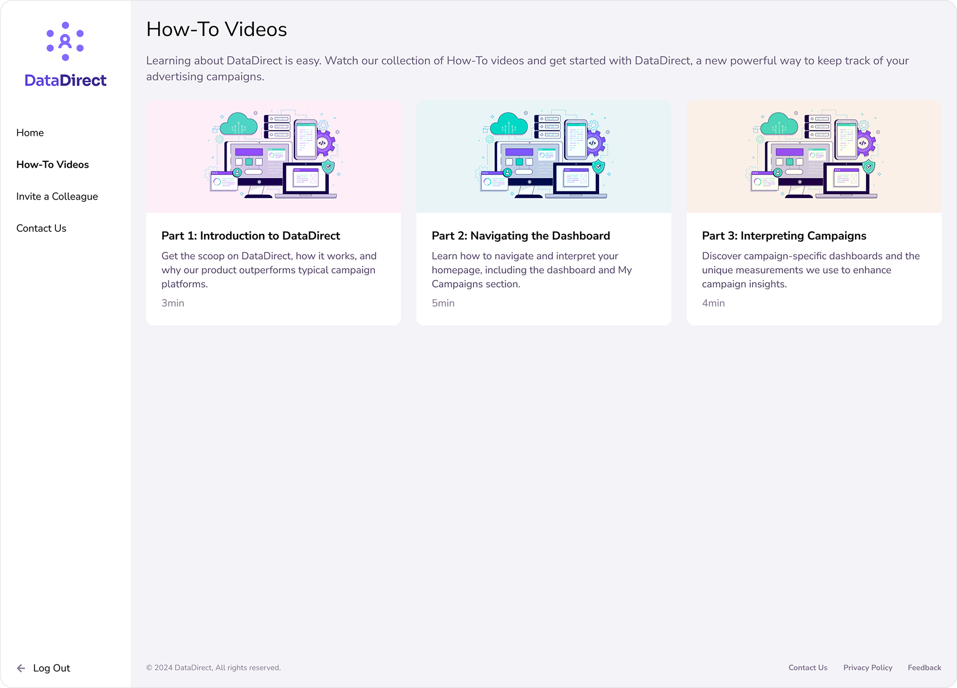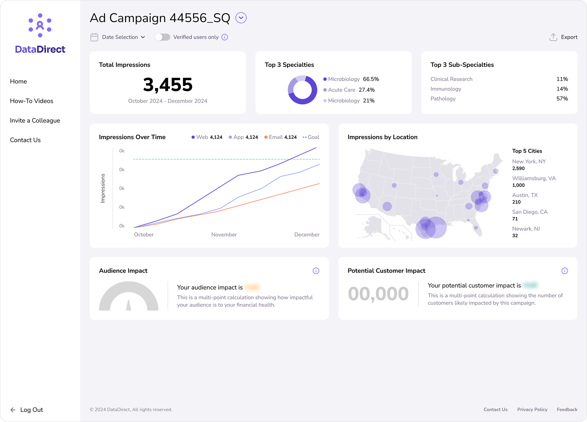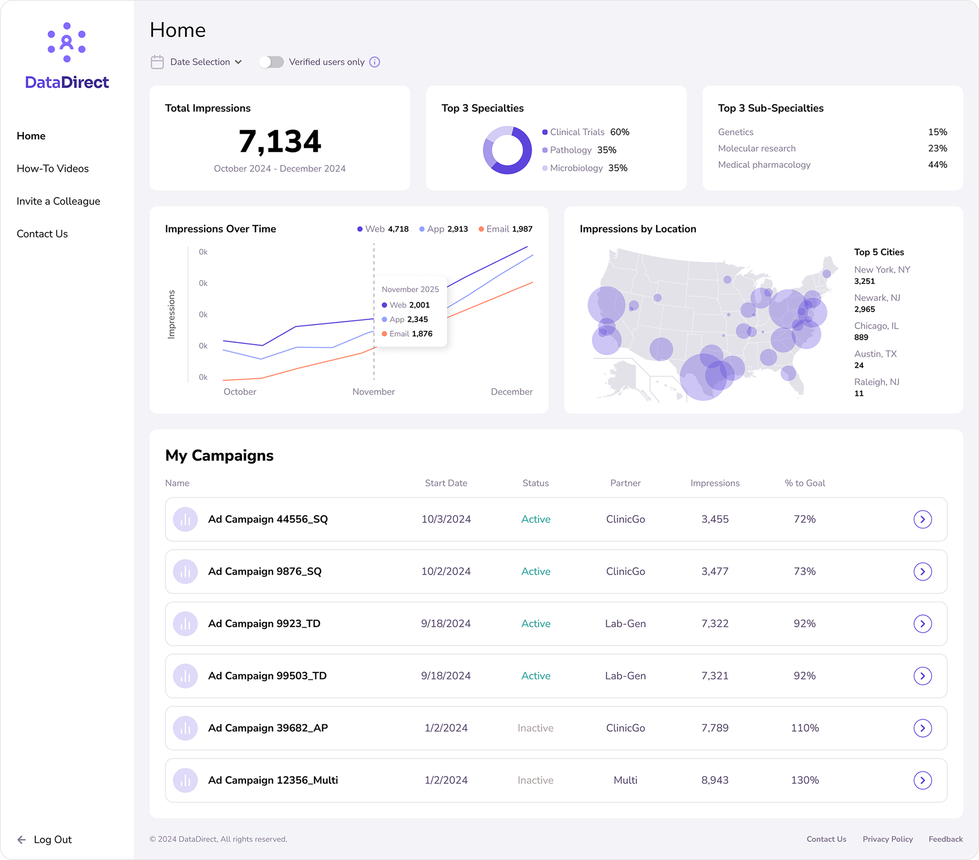 First, DataDirect users sign in to see a dashboard as their homepage, pre-populated with their campaigns.