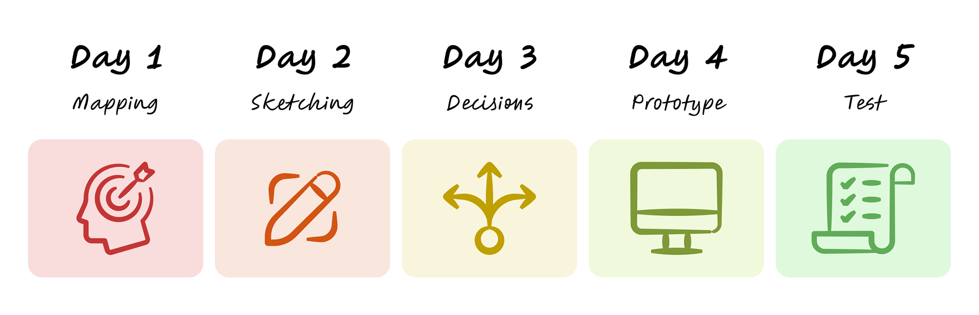 A Design Sprint is a five-day process developed by Jake Knapp and John Zeratsky at Google Ventures. It helps teams rapidly move from problem to tested solution through five key phases: