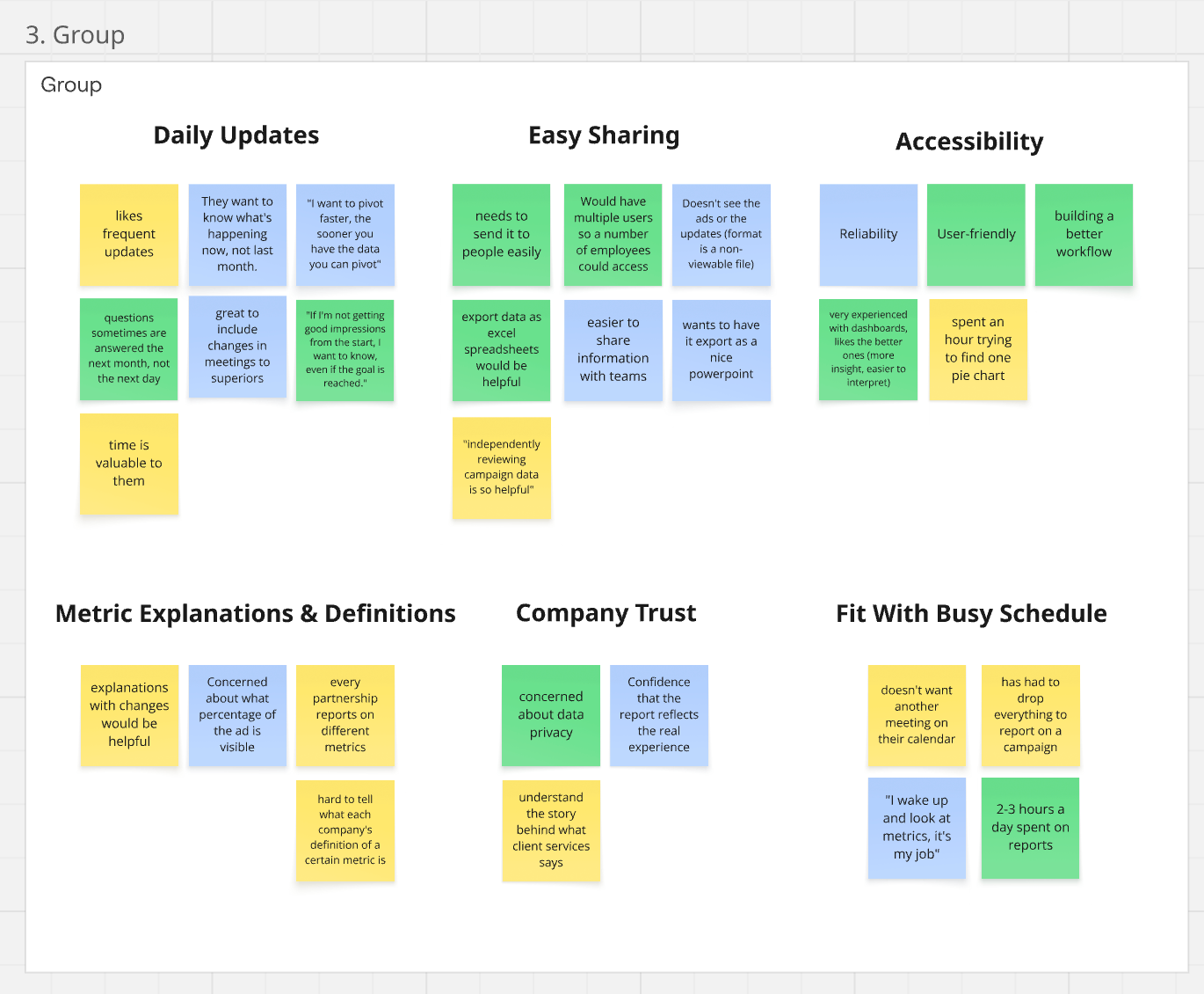 Before the sprint began, our team conducted client interviews to understand their needs. Insights from these interviews were organized using an Affinity Diagram - a method for grouping related ideas and observations to reveal patterns and prioritize features.