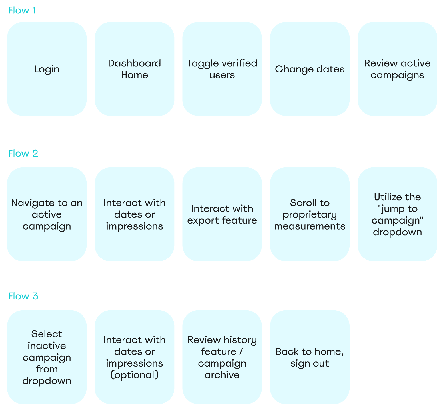 We took each test user through 3 flows, which were identified on Day 3 of the sprint as the most crucial for measuring product fit.