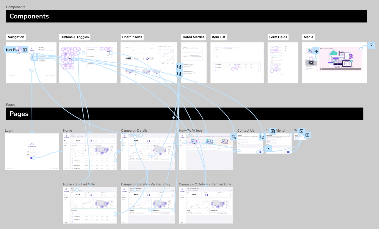 Lastly, using Figma's prototype mode, I created interactions by connecting elements (blue arrows) and creating state changes for interactive components (purple). Each connection is a command to overlay, navigate to, or introduce another element.